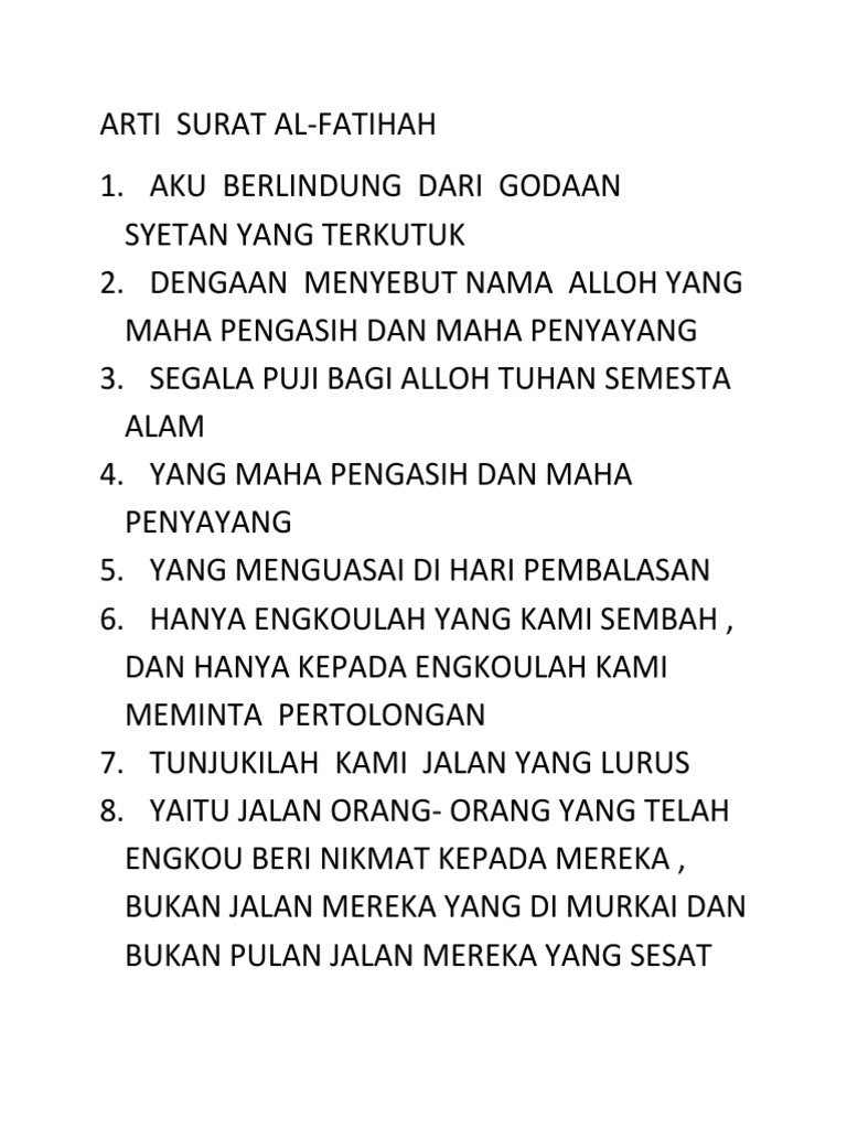 Haturnuhun udh mengingatkan kmbali arti dr surat alfatihah. Yuk simak lebih lanjut artikel ini. Adapun, arti surat al fatihah. You can also download any surah (chapter) of quran kareem from this website. Uraian lengkap yang berisi arti perkata surat al fatihah atau mufradat menggunakan bahasa indonesia dan inggris lengkap dari berikut ini adalah uraian lengkap mengenai arti perkata surat al fatihah menggunakan 2 bahasa yaitu bahasa indonesia dan inggris Surat ini tergolong surat makkiyah karena diturunkan di mekkah. Alhamdulillah, segala puji bagi allah yang telah memberikan hidayah islam kepada kita semua. Surah al fatihah disebut juga sebagai ummul. Surah ini diturunkan di mekah dan terdiri dari 7 ayat. Surat ini memasuki urutan surat yang pertama di dalam al qur'an dan memiliki arti pembuka. Surah ini diturunkan dimekkah yang terdiri dari 7 ayat dan surah pertama. Istilah lain yang kerap disandingkan dengan surat ini adalah 7 untuk memahami lebih lanjut tentang surat al fatihah termasuk bahasa arab, latin dan terjemahannya. Kandungan surat al fatihah berisi mengenai keagungan allah untuk menunjukkan jalan yang lurus.