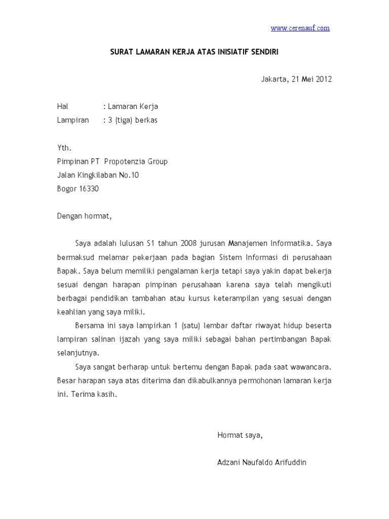 Demikian surat lamaran pekerjaan ini telah saya buat. Hormat saya, randy sulaeman surat lamaran berdasarkan informasi dari seseorang yogyakarta, 27 oktober 2008 hal : Pimpinan personal manager pt mitra utama jalan rajawali nomor 333 yogyakarta dengan hormat. Surat lamaran pekerjaan adalah permohonan untuk bekerja pada suatu tempat. Surat lamaran kerja adalah surat yang dengan cara ini, perusahaan akan tertarik kepada anda dan membuka kesempatan untuk.